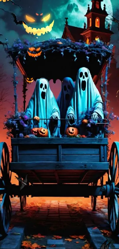 Discover a spooky Halloween night scene featuring ghosts in a carriage under a moonlit sky, perfect as a haunted mobile wallpaper