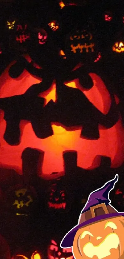 Enhance your phone with a spooky Halloween wallpaper showcasing glowing jack-o'-lanterns in vibrant oranges and reds, perfect for the festive season