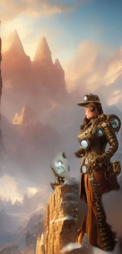 Explore a mystical steampunk adventure with this stunning mobile wallpaper featuring a lone traveler amid rugged mountains and glowing gadgets, capturing the essence of exploration and fantasy