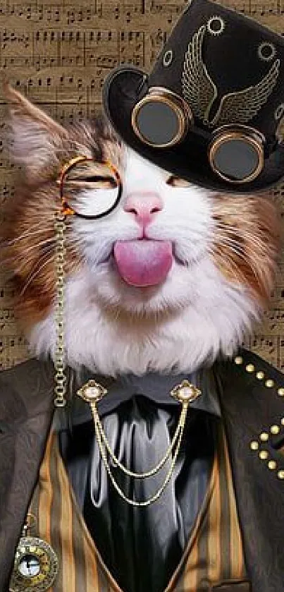 Discover a whimsical cat dressed in steampunk attire, perfect for adding a quirky touch to your mobile screen. This detailed wallpaper combines vintage elegance with feline charm, featuring a cat with a top hat, monocle, and musical background