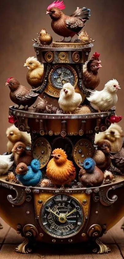 Explore a whimsical steampunk world with intricate chicken motifs in this fantasy art wallpaper, perfect for adding unique flair to your phone's background