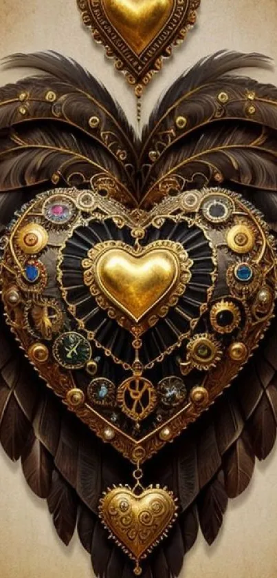Explore a steampunk heart gear mobile wallpaper with intricate gold details and dark feathers for a unique artistic background