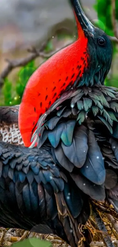 Admire the captivating display of a frigatebird with vibrant red gular pouch against lush greenery, perfect for nature and wildlife enthusiasts seeking a bold mobile wallpaper. Ideal for adding a dynamic touch to your device, featuring striking colors and intricate feather details