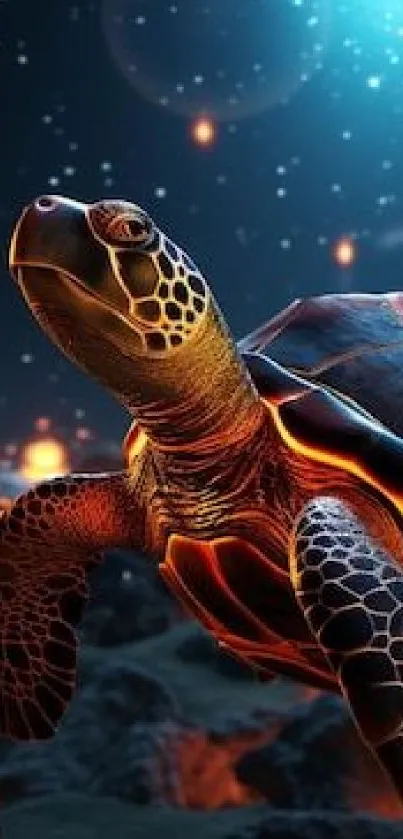 Explore a vibrant sea turtle in a cosmic fantasy setting, perfect for your mobile wallpaper
