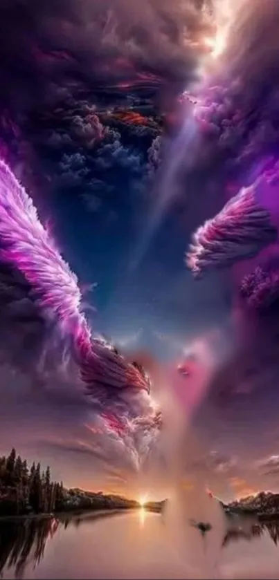 Explore this stunning mobile wallpaper featuring a mystical fantasy cloudscape with vivid purple and pink hues, perfect for adding a magical touch to your screen. This awe-inspiring scene captivates with its artistic blend of sunset colors, ethereal clouds, and scenic reflections