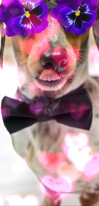 Download this charming mobile wallpaper featuring a dapper dog with a bow tie and playful heart-shaped bokeh, perfect for adding a touch of whimsy and style to your screen