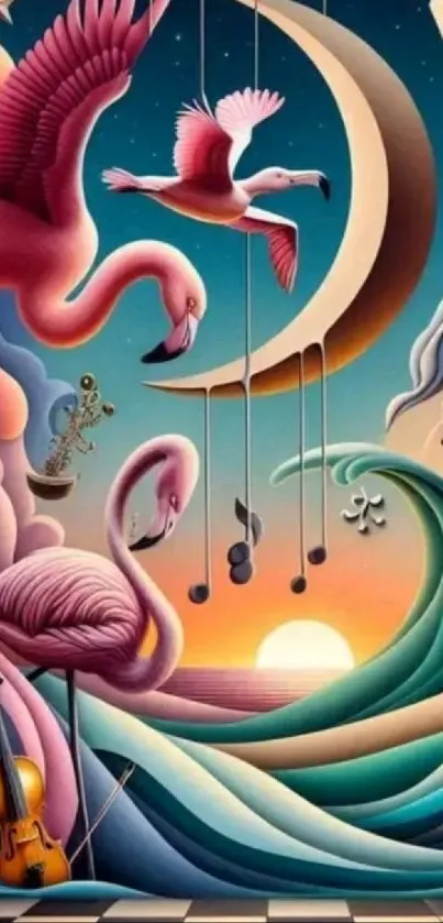 Explore a surreal fantasy art featuring vibrant flamingos with musical and celestial elements, perfect for a unique mobile wallpaper