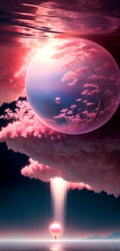 Experience a surreal pink dreamscape with a glowing orb, celestial elements, and a serene reflection, perfect for a calming phone background