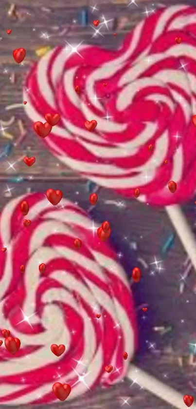 Vibrant heart-shaped lollipops with red and white swirls create a perfect sweet love theme for your mobile wallpaper. Accentuated with sparkling effects and scattered mini hearts, this wallpaper brings a playful and romantic touch to your screen