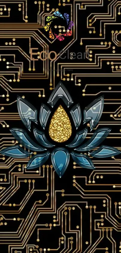 Enhance your device with a tech-inspired lotus design set against an intricate gold circuit background, perfect for tech lovers seeking a blend of nature and innovation in their mobile wallpaper