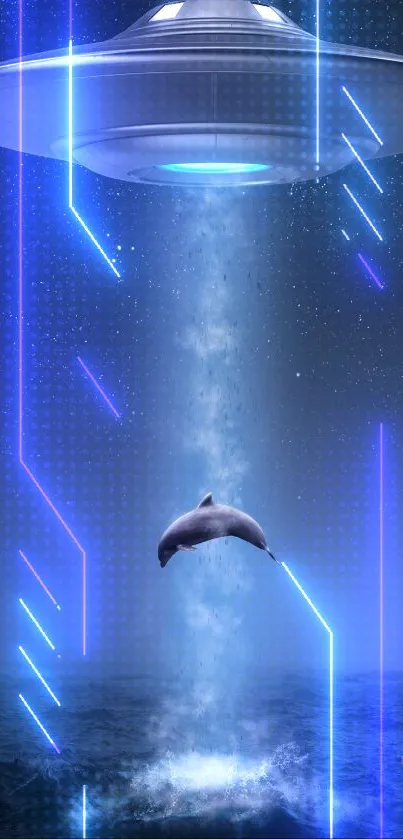 Explore a captivating mobile phone wallpaper featuring a futuristic UFO hovering over the ocean, with a dolphin captured mid-air. Perfect for fans of sci-fi and surreal landscapes, this wallpaper combines outer space elements with marine life in a stunning visual