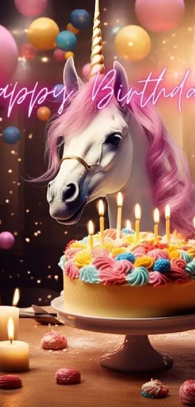 Experience a whimsical birthday celebration with a vibrant unicorn cake and glowing candles, perfect for a magical ambiance
