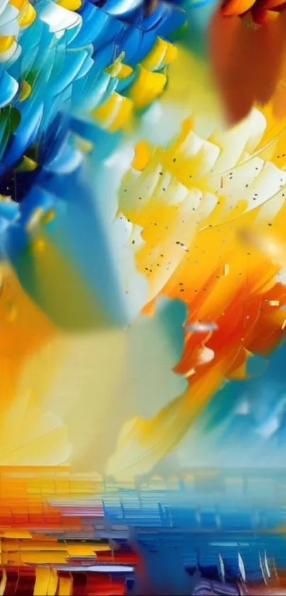 Explore a stunning abstract art wallpaper with vivid colors and dynamic forms to enhance your mobile display. This design features bright blue, yellow, and orange hues, offering a visual feast to enliven your digital space. Ideal for art lovers seeking unique and vibrant backgrounds