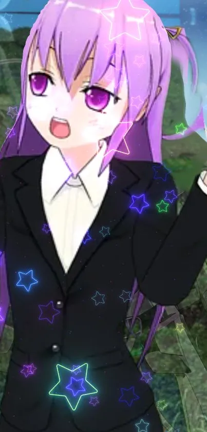 Discover a vibrant anime wallpaper featuring a lively character with purple hair, adorned with colorful stars. Ideal for personalizing your mobile screen with a touch of whimsical charm and creative flair, enhancing your phone's aesthetic appeal
