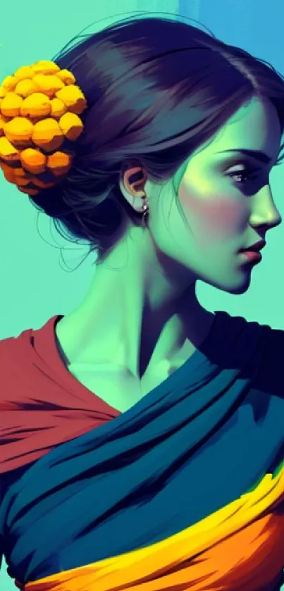 Explore this vibrant artistic portrait wallpaper featuring a stunning digital illustration of a woman with a colorful, creative design, perfect for enhancing your mobile's aesthetic appeal