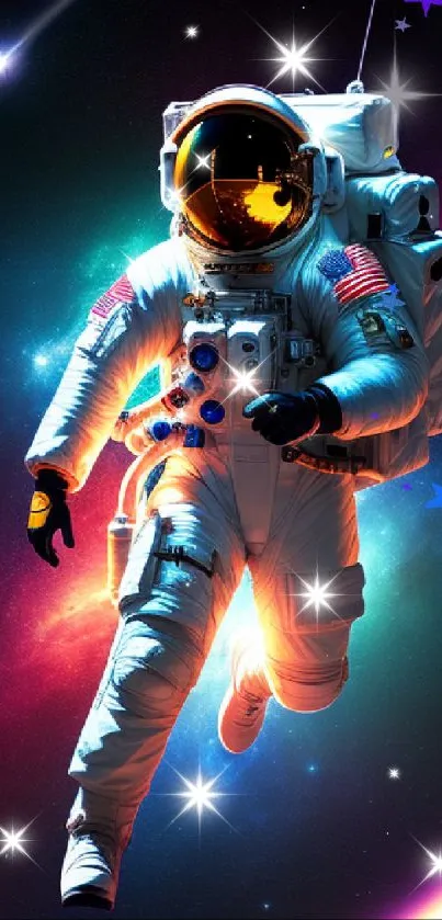 Download this stunning mobile wallpaper featuring a vibrant astronaut floating in colorful cosmic space, perfect for space enthusiasts and digital art lovers seeking an out-of-this-world phone background. Rich hues of blue, purple, and orange create an inspiring visual journey