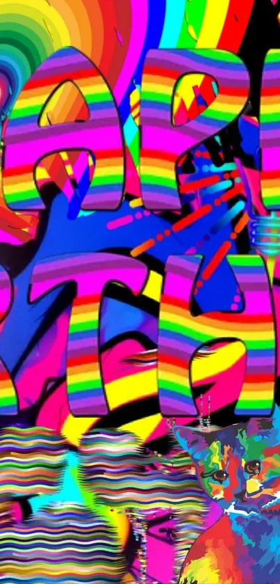 Celebrate with this vibrant, rainbow-themed birthday wallpaper featuring psychedelic designs and a colorful cat, perfect for creating a festive atmosphere on your phone screen