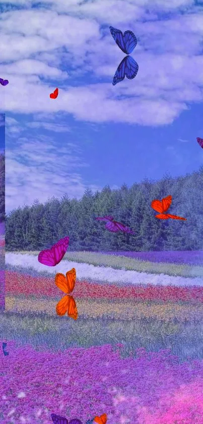 Explore a vibrant mobile wallpaper featuring colorful butterflies soaring over a lush field, blending vivid purples and oranges with a serene blue sky, perfect for adding a touch of nature and whimsy to your device