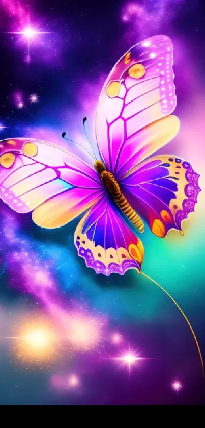 Explore the vibrant butterfly space art wallpaper featuring a radiant cosmic backdrop, ideal for mobile screens