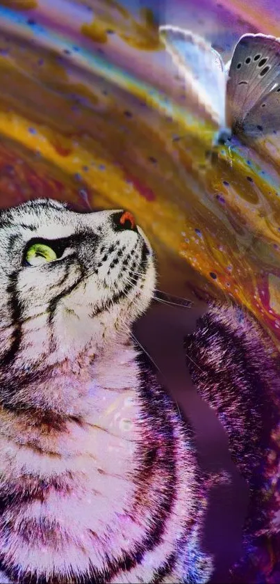 Explore a vibrant mobile wallpaper featuring a curious cat gazing at colorful butterflies in a surreal, colorful cosmic setting. Perfect for those who love nature and fantasy