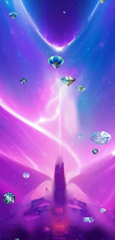 Explore a vibrant cosmic display featuring radiant diamond-like elements against a mystical purple and blue backdrop, perfect for adding a touch of ethereal elegance to your mobile screen
