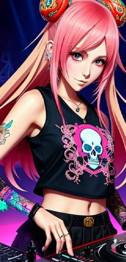 Experience a colorful anime DJ scene with vibrant neon lights, showcasing a dynamic female DJ with stunning tattoos. Perfect for fans of anime and electronic music art. High-quality mobile wallpaper designed to enhance your device's visual appeal