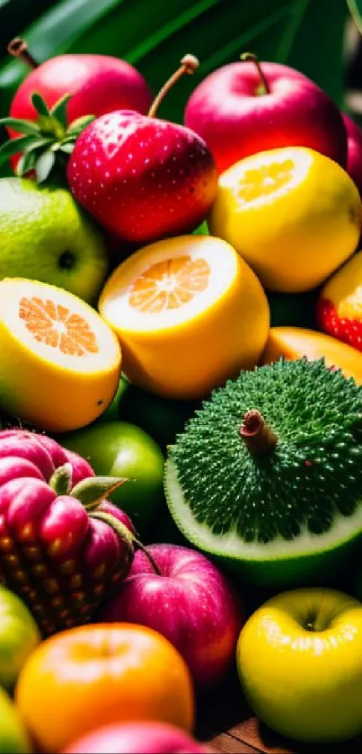 Brighten your screen with this vibrant mobile wallpaper featuring an array of colorful exotic fruits, perfect for adding a splash of tropical freshness to your device