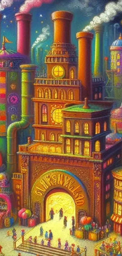 Experience a vivid and colorful fantasy factory scene with detailed artistry and whimsical design, perfect for mobile backgrounds