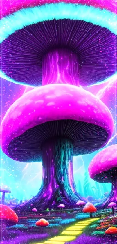 Explore a vibrant fantasy landscape with towering mushrooms glowing in electric hues, perfect for transforming your mobile screen into a whimsical wonderland