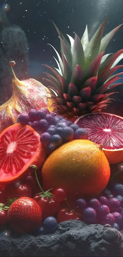 Enhance your device with a vibrant fruit fantasy wallpaper featuring a stunning array of colorful fruits in a mystical setting, perfect for those seeking a unique and lively background