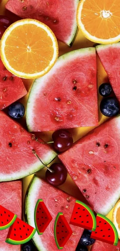 Bright and colorful fruit wallpaper featuring juicy watermelon, oranges, cherries, and blueberries, perfect to refresh your mobile screen