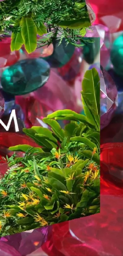 Download a vibrant mobile wallpaper featuring colorful gemstones with the words 'Freedom' and a scenic view, ideal for adding a splash of color and symbolism to your device