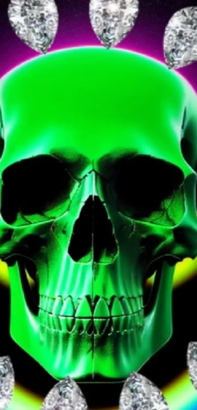 Discover a striking mobile wallpaper featuring a vibrant green skull surrounded by radiant gems, set against a vivid gradient background. Perfect for fans of bold, artistic designs
