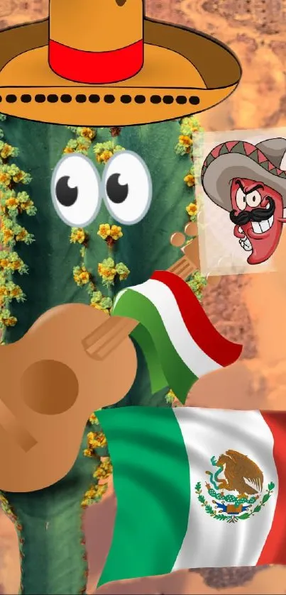 Explore a vibrant Mexican fiesta with this colorful wallpaper featuring a cactus, guitar, sombrero, and lively elements embodying Mexican culture