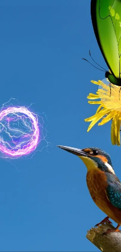 Explore a vibrant nature mobile wallpaper featuring a vivid blue sky, a colorful butterfly, and a glowing orb, offering a unique burst of color and life to your phone's screen