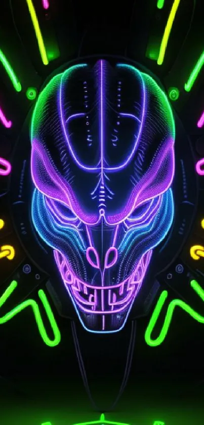 Explore a vibrant neon alien face design on a dark background, perfect for a futuristic and eye-catching mobile wallpaper. Enhance your phone with bold colors and sci-fi aesthetic, featuring vivid blues, purples, and greens