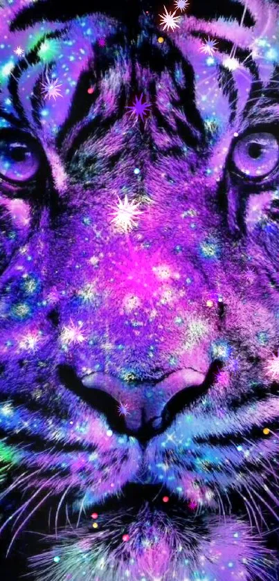 Explore the vivid allure of a neon tiger with this stunning mobile wallpaper, featuring striking purple and blue hues accented by a galaxy of glowing stars