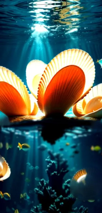 Dive into a vibrant ocean fantasy with glowing shells and shimmering blue water in this captivating wallpaper. Perfect for adding a touch of aquatic elegance to your phone's display, this artwork blends imagination with natural beauty, creating a serene underwater atmosphere