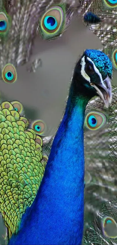 Stunning mobile wallpaper featuring a vibrant peacock with iridescent blue and green feathers, ideal for nature lovers seeking a splash of color