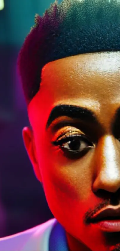 Experience a bold and vibrant phone wallpaper showcasing a half portrait with striking makeup amid neon urban lighting, perfect to make your screen stand out with vivid colors and style