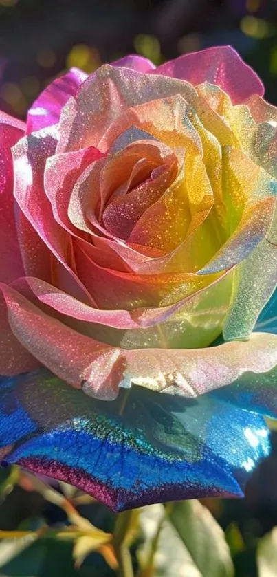Discover a vibrant rainbow rose on this mobile wallpaper, showcasing nature's colorful beauty with sparkling petals