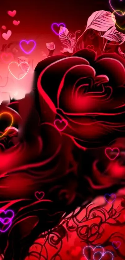 Download this vibrant red rose mobile wallpaper, featuring glowing heart accents, perfect for enhancing the beauty of your screen