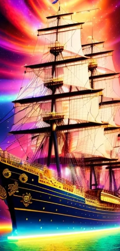Immerse your mobile screen with a mesmerizing wallpaper featuring a majestic ship sailing under a swirling galaxy sky, showcasing vibrant colors and a serene ocean view. Perfect for those who love nautical adventures and cosmic wonders