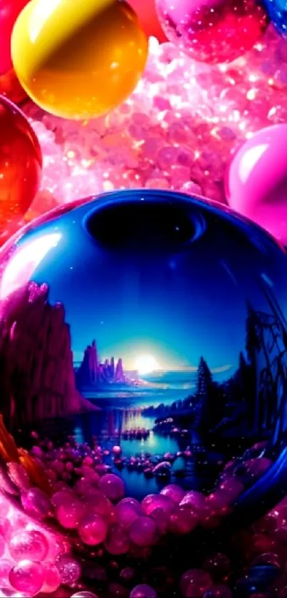 Immerse yourself in vibrant fantasy art with colorful spheres and a surreal landscape, perfect for adding a pop of color to your mobile wallpaper. This striking image features pink, blue, and purple hues, providing a unique and artistic look for your phone screen