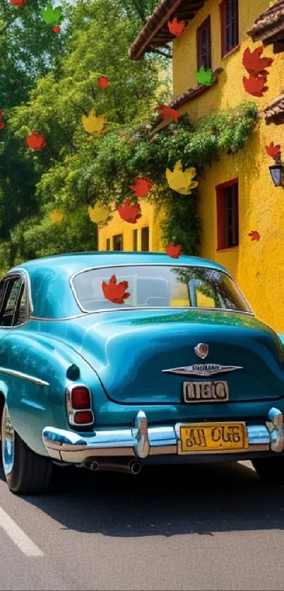 Discover a vibrant vintage car under falling autumn leaves, perfect for a nostalgic mobile wallpaper
