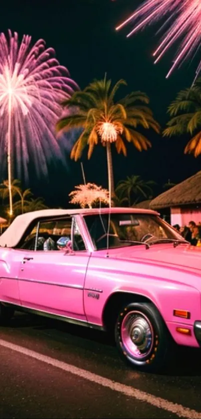 Experience a nostalgic evening with a vintage pink car under vibrant fireworks and palm trees, perfect for your mobile wallpaper capturing classic vibes and festive illumination