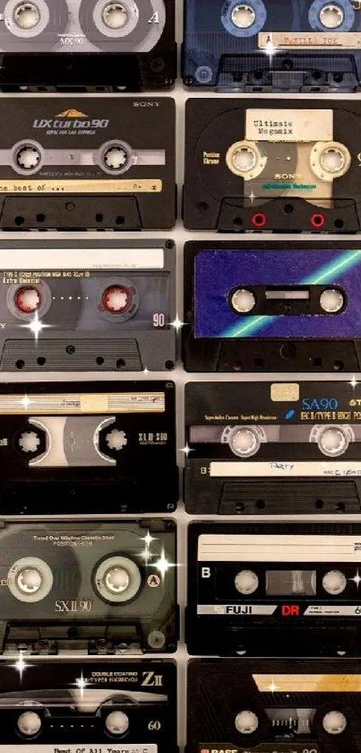 Explore a retro-themed wallpaper featuring an array of vintage cassette tapes, perfect for a nostalgic mobile background. This unique pattern highlights the classic charm of analog music, adding a touch of nostalgia to your device. Ideal for music lovers and retro enthusiasts