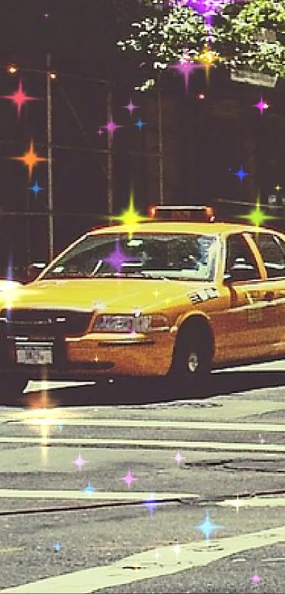 Stylish vintage urban wallpaper featuring yellow taxis on a sunny city street, perfect for mobile display