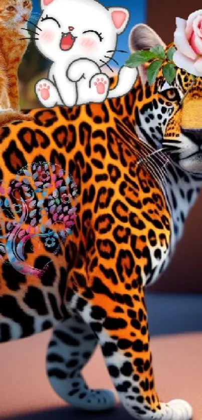Explore a whimsical collage featuring a majestic leopard, a playful cartoon cat, a delicate rose, and an adorable kitten on this mobile phone wallpaper. Ideal for animal lovers seeking a unique blend of artistry and nature in vibrant colors