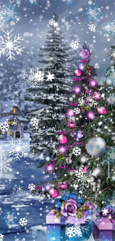 Enjoy this festive mobile wallpaper featuring a decorated Christmas tree surrounded by snow, vibrant ornaments, and a cozy cabin, perfect for adding a touch of holiday spirit to your phone